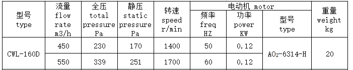 CWL-160D 舰船用小型离心通风机,为电机直联式结构,可制成卧式或立式。本型风机的机壳材质为Q235、叶轮采用L104铝板制成。叶轮为铆接组成,进风口和机壳为焊接结构。